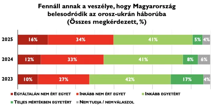 2025 őszén a magyarok fele nem értett egyet azzal az állítással, hogy Magyarország belesodródhat az orosz-ukrán háborúba. Ezzel szemben 46 százalék volt azok aránya, akik valamilyen mértékben tartanak ettől. A magyar társadalom tehát rendkívül megosztott a háborús veszély értékelésében, de az enyhe többség már nem tart attól, hogy Magyarország háborúba sodródna.