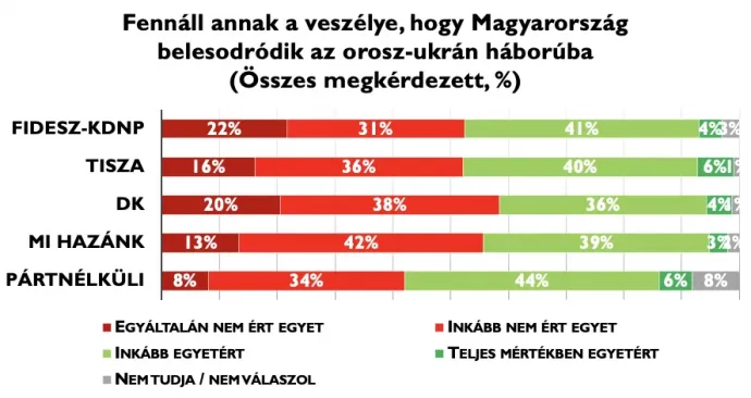 A pártpreferenciák mentén jóval kisebbek a különbségek az egyes táborok között, mint a magyar belpolitika sok más kérdésében. A Fidesz–KDNP szavazóinak 45 százaléka tartja valós veszélynek azt, hogy Magyarország belesodródhat a háborúba, míg a kormánypártiak többsége nem tart ettől. Kisebbségben vannak a háborútól tartó válaszadók a Tisza Párt, a DK és a Mi Hazánk támogatói között is. Egyedül a párt nélküliek csoportjában vannak többen azok, akik szerint Magyarország belesodródhat a háborúba.