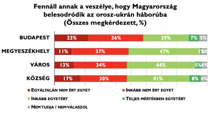 Települési bontásban Budapesten a legalacsonyabb az aggodalom szintje, ahol mindössze a megkérdezettek 36 százaléka értett egyet azzal, hogy Magyarországot háborús veszély fenyegeti. A budapestiek közel 60 százaléka nem tart attól, hogy Magyarország belesodródhat a konfliktusba. Tehát a fővárosban a legerősebb a biztonságérzet és a szkepszis a háborús narratívával szemben. Ezzel szemben az ország többi részén a lakosság nagyjából fele-fele arányban oszlik meg: a megyeszékhelyeken, a kisvárosokban és a falvakban is az ott élők közel fele gondolja úgy, hogy fennáll a háborúba sodródás veszélye, míg a másik fele távolságtartással kezeli a háborús narratívát.