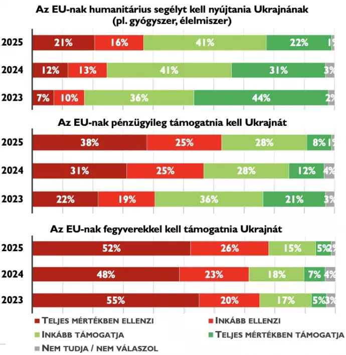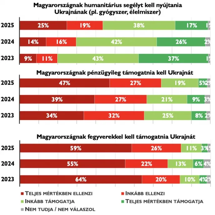A katonai támogatás kérdésében a magyar társadalom következetesen elutasító maradt az utóbbi években: 2023-ban 75 százalék 2024-ben 71 százalék 2025-ben pedig már 78 százalék ellenzi, hogy az EU fegyverekkel támogassa Ukrajnát. Az összes politikai csoportban jelentős többsége van a Kijevnek szánt katonai segítség elutasításának.