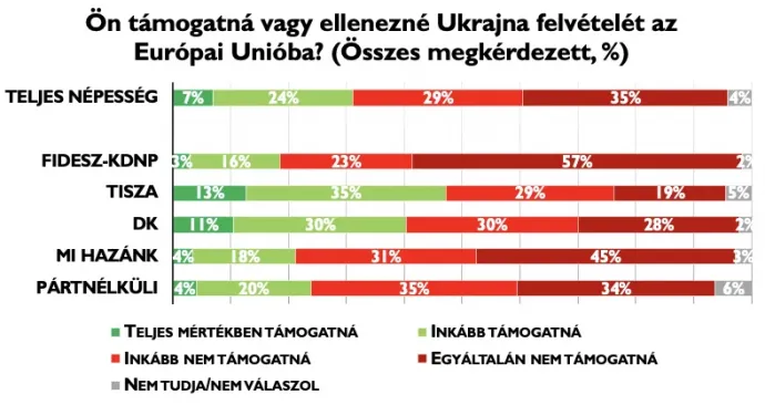A pártpreferencia szerinti bontás kimutatja, hogy míg a kormánypárti szavazók viszonylag egységesek a kérdésben, addig az ellenzéki szavazókat megosztja Ukrajna EU-tagságának témája. A Fidesz–KDNP táborában rendkívül alacsony a támogatók aránya (19%), tízből nyolc kormánypárti válaszadó elutasítja azt. A Tisza Párt szavazói között ugyanannyian támogatnák, mint ahányan ellenzik Ukrajna felvételét az Európai Unióba (48%-48%). Az adataink megerősítik, hogy a Tisza tábora erősen megosztott a kérdésben, ugyanakkor a kutatásunk alapján nincs többsége egyik álláspontnak sem a kérdésben. A DK-szavazók között átlag feletti az Ukrajna EU-tagságát támogatók aránya (41%), de a párt támogatóinak többsége így is elutasító a kérdésben (58%). A Mi Hazánk tábor hasonlóan vélekedik, mint a Fidesz támogatói (76 százalék ellenzi, 22 százalék támogatja), és a pártnélküliek között is jelentős többségben vannak az ellenző állásponton lévő válaszadók.