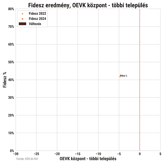 A Veszprém 2-es, Balatonfüred központú választókerületben például szintén a „központ”, vagy „város” kategóriához soroltam az amúgy kétszer akkora lakosságszámú Várpalotát is, tehát a két nagyobb központi település átlagolt 2024-es Fidesz eredménye (41,4%) áll szemben a választókerület maradék 43 településének átlagával (43,2%). Mint az látható, a különbség itt minimálisra olvadt centrum és periféria között, miközben 2022-ben még sokkal jelentősebb volt. Akkor a Fidesz a Balatonfüred–Várpalota párosban átlagosan 46,5 százalékot kapott, a választókerület az összes többi kisebb településén átlagosan viszont már 53,9 százalékon állt. A fenti tényezőtől nem teljesen független, hogy ebben a választókerületben sokkal nyíltabb kimenetelű küzdelemre lehet számítani jövő tavasszal. A Tisza Párt várhatóan a párt alelnökét, Forsthoffer Ágnest indítja majd. 2022-ben Kontrát Károly, a Belügyminisztérium parlamenti államtitkára nyerte el itt a Fidesz számára a mandátumot, meggyőző többséggel.