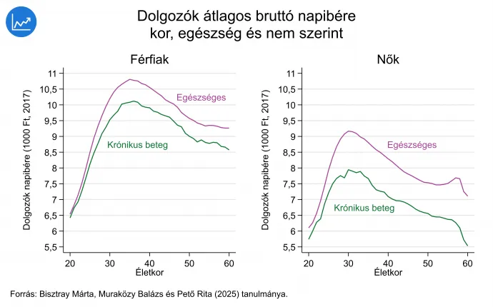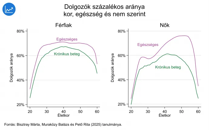 Az első ábra azt mutatja, hogy a különböző korú férfiak és nők hány százaléka dolgozik annak függvényében, hogy krónikus betegséggel élnek (zöld vonal) vagy sem (lila vonal). A férfiaknál átlagosan 7, a nőknél 14 százalékponttal kevesebben dolgoznak a krónikus betegséggel élők közül mint a nem beteg emberek közül. Ez a különbség az életkor előrehaladtával tovább nő: az 50 év feletti nőknél meghaladja a 20 százalékpontot.