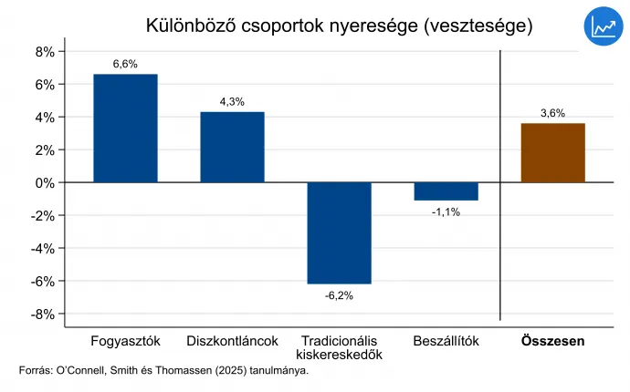 A kutatók azt mutatták ki, hogy a fogyasztói többlet – a vásárlók számára keletkező nyereség pénzben kifejezett értéke – közel 7 százalékkal nőtt a diszkontláncok terjeszkedésének hatására, ami az alacsonyabb áraknak, a nagyobb választéknak és az új üzletek megnyílásával járó rövidebb utazási időnek köszönhető.